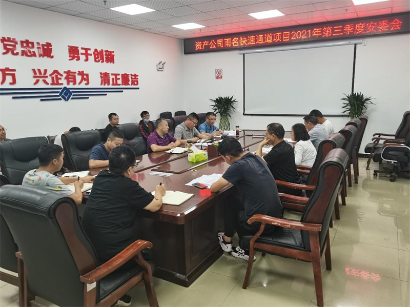 9月9日,资产公司召开雨名快速通道项目2021年第三季度安委会,对雨名快速通道项目第三季度安全工作情况进行总结,对四季度安全工作进行安排布置。资产公司经营班子成员及部门负责人,项目总监办总监理工程师、安全监理工程师、各施工项目部项目及安全负责人参加会议。