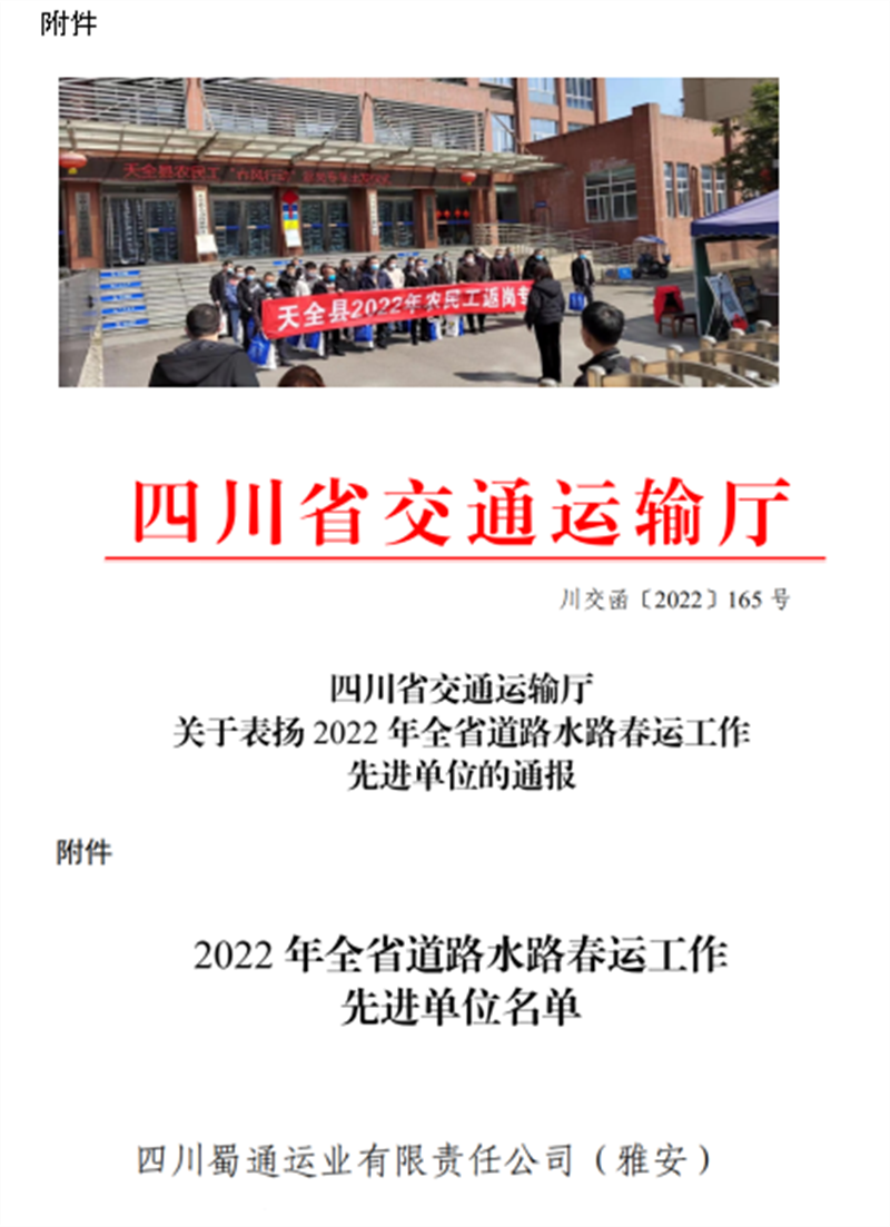 蜀通公司荣获“2022年全省道路水路春运工作先进单位”称号