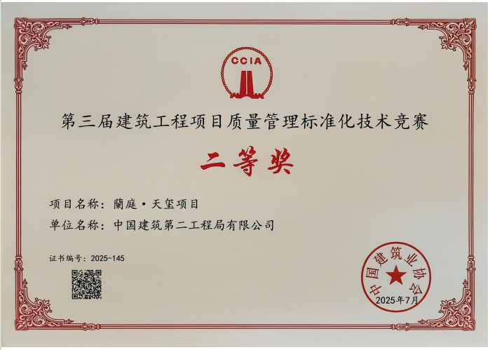 近期,交建开发公司旗下“蘭庭・天玺”项目在中国建筑业协会组织的“第三届建筑工程项目质量管理标准化技术竞赛”中荣获二等奖。此次获奖,标志着“蘭庭・天玺”项目的质量管理体系与工程实体质量取得了行业权威认可,为项目后续创建更高层次的品质奖项积累了宝贵经验。