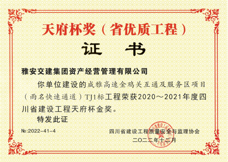 成雅高速金鸡关互通及服务区项目(雨名快速通道)TJ1标工程荣获四川省建设工程天府杯金奖