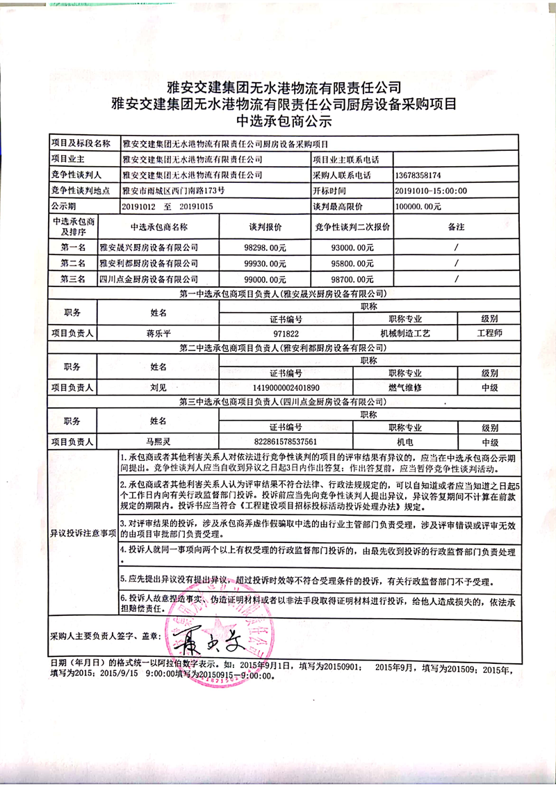 大红鹰dhy(中国)集团无水港物流有限责任公司厨房设备采购项目中选承包商公示