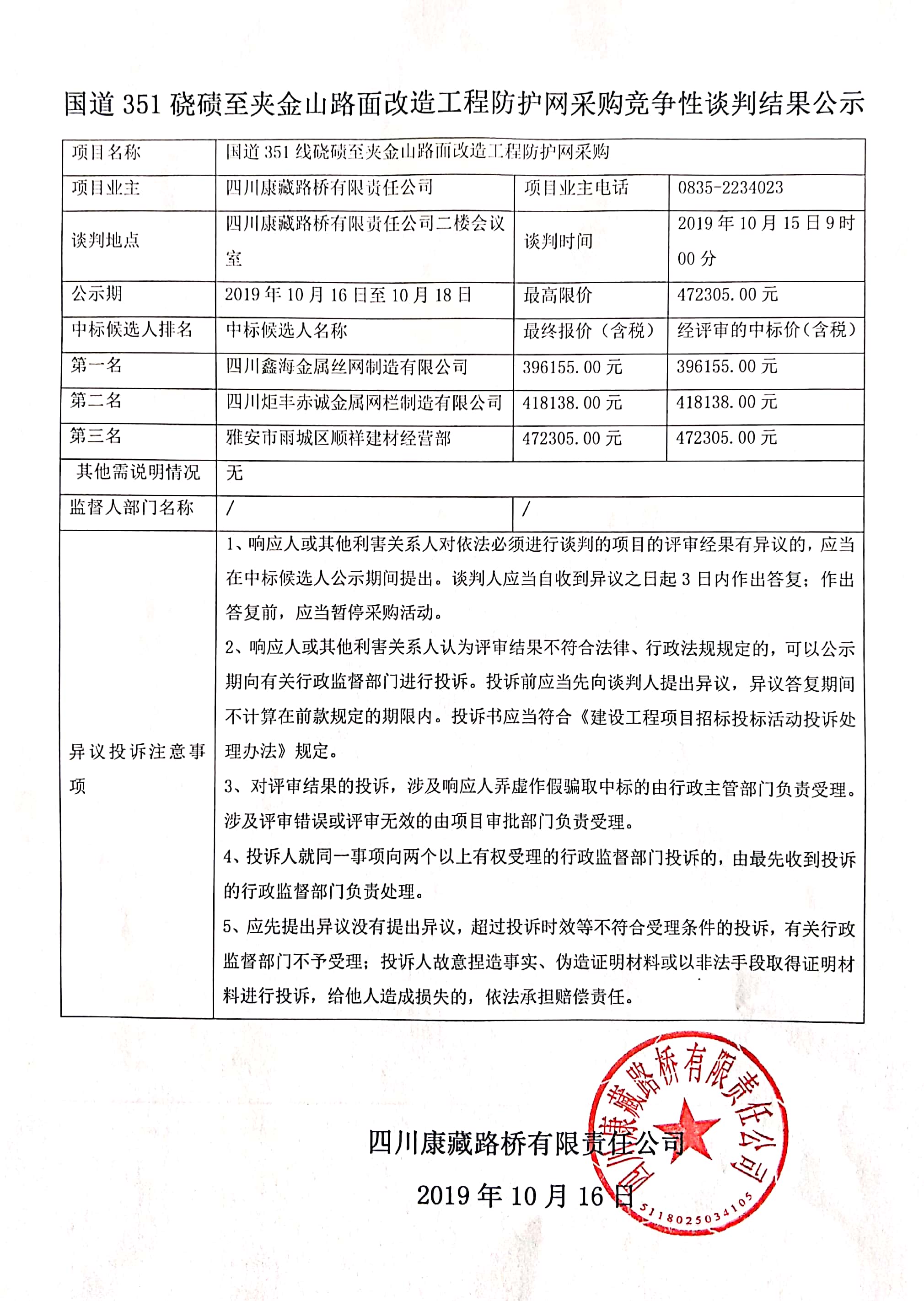四川康藏路桥有限责任公司国道351硗碛至夹金山路面改造工程防护网采购竞争性谈判结果公示