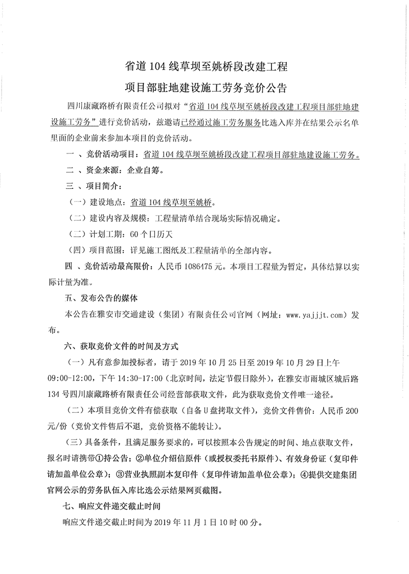 四川康藏路桥有限责任公司省道104线草坝至姚桥段改建工程项目部驻地建设施工劳务竞价公告