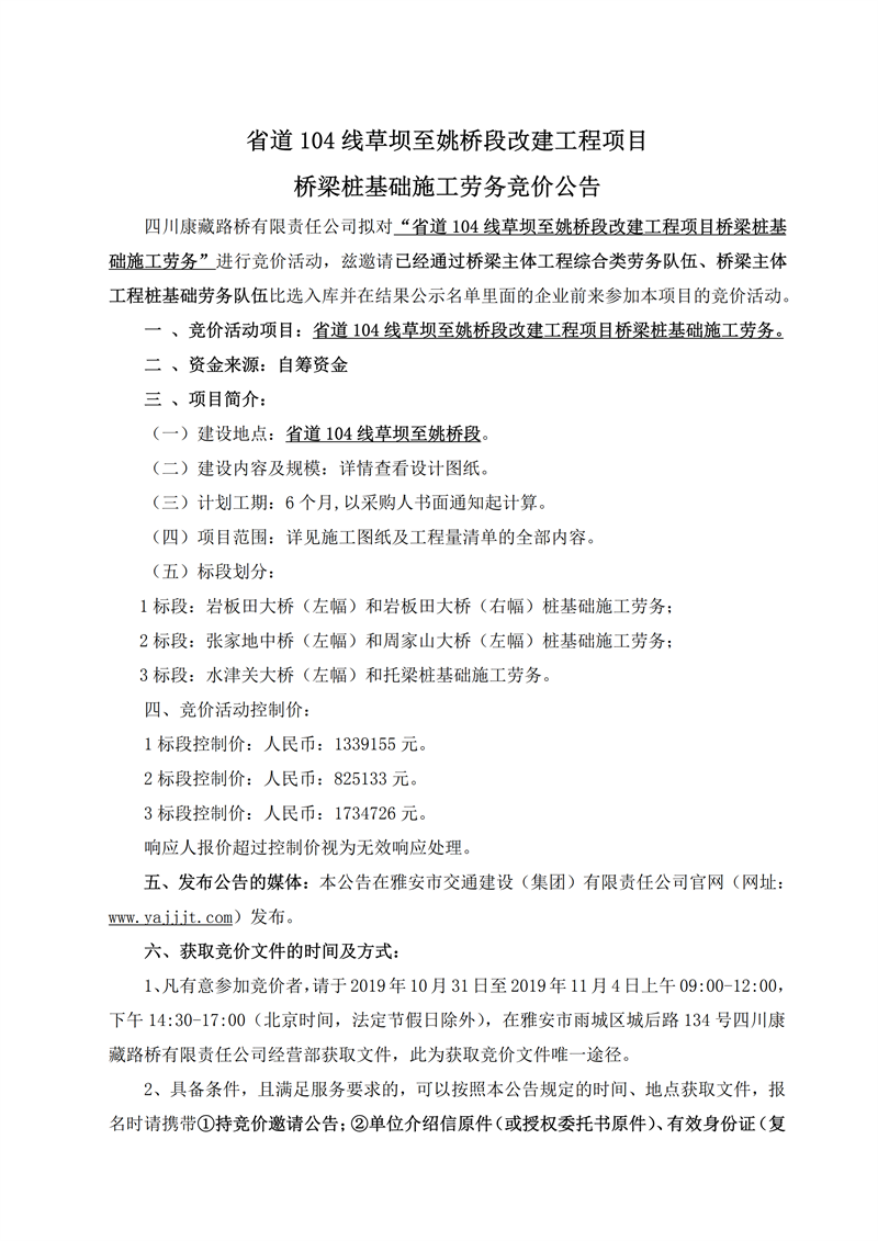 四川康藏路桥有限责任公司省道104线草坝至姚桥段改建工程项目桥梁桩基础施工劳务竞价公告