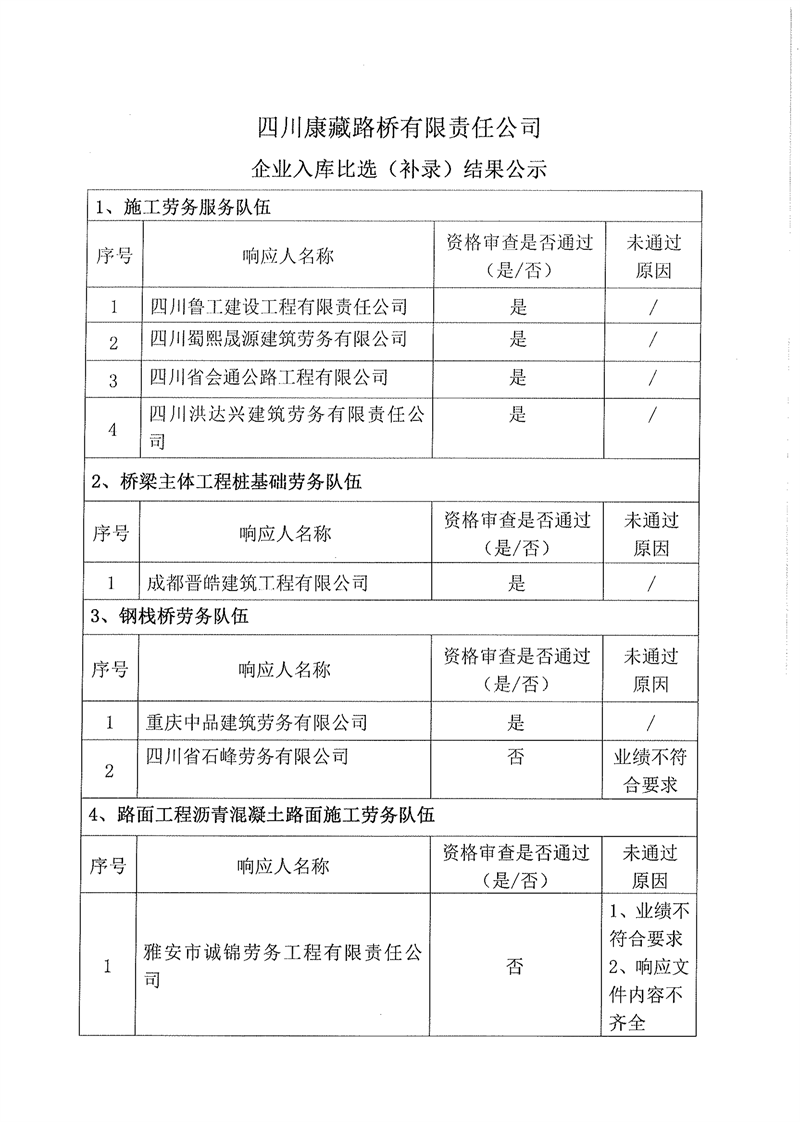 四川康藏路桥有限责任公司企业入库比选(补录)结果公示