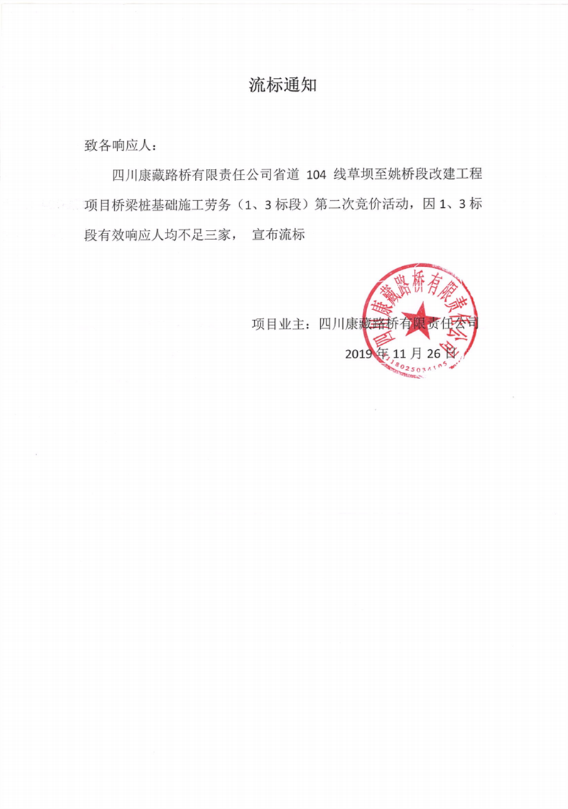 四川康藏路桥有限责任公司省道104线草坝至姚桥段改建工程项目桥梁桩基础(1、3标段)施工劳务竞价(第二次)流标通知
