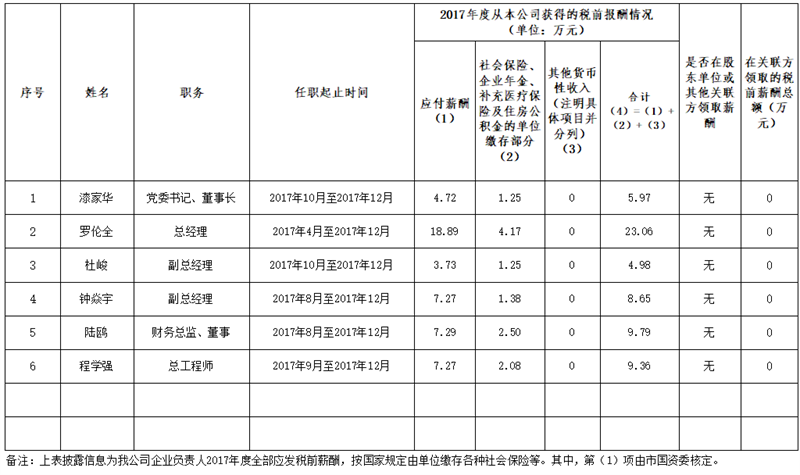 雅安市交通建设(集团)有限责任公司企业负责人2017年度薪酬情况公示表