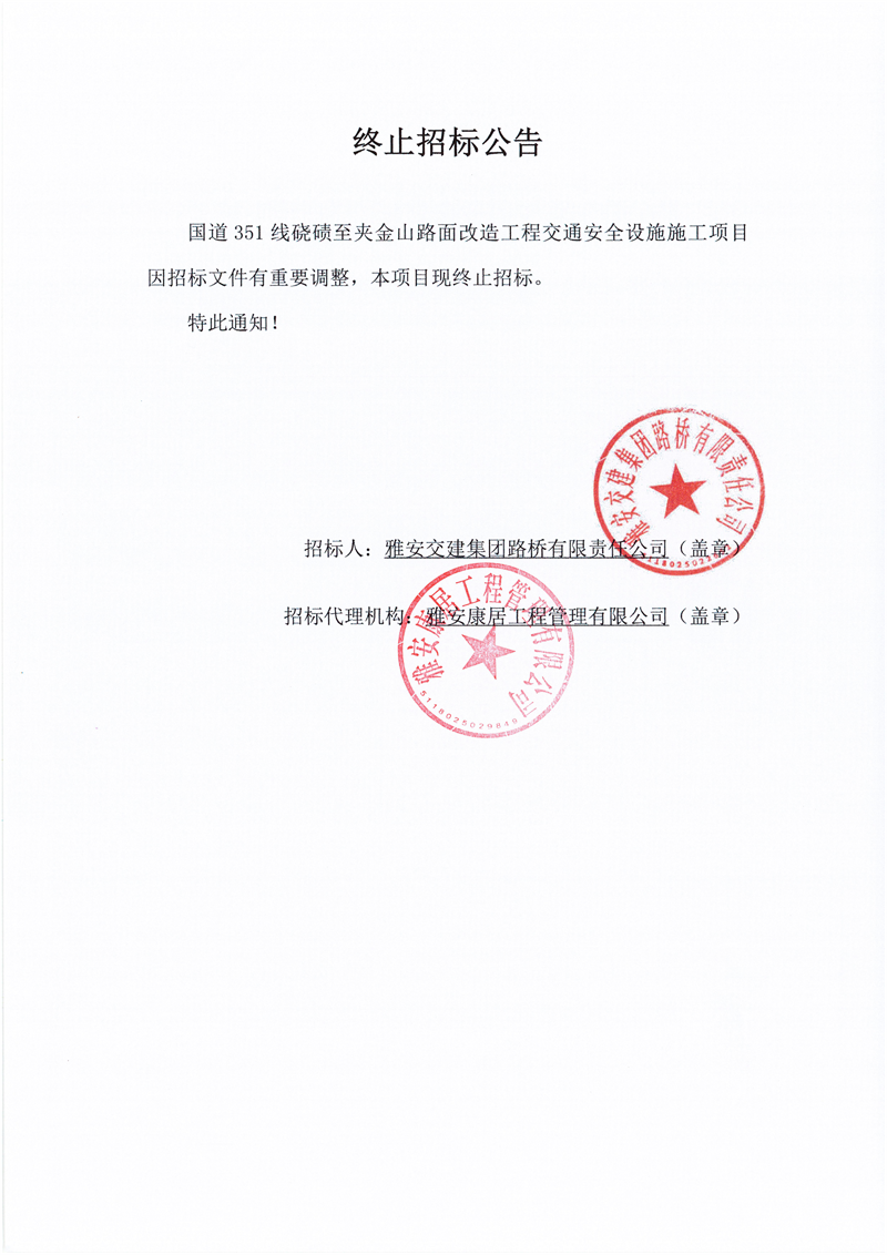 大红鹰dhy(中国)集团路桥有限责任公司国道351线硗碛至夹金山段路面改造工程交通安全设施施工项目终止招标公告
