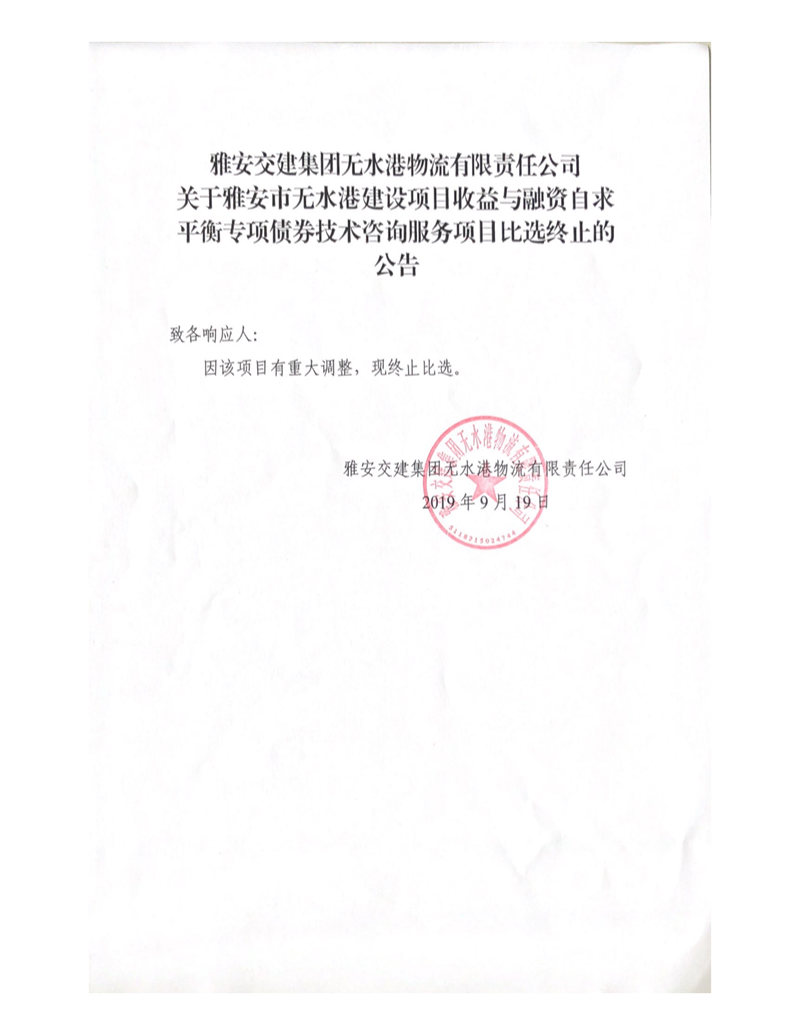 大红鹰dhy(中国)集团无水港物流有限责任公司关于雅安市无水港建设项目收益与融资自求平衡专项债券技术咨询服务项目比选终止的公告