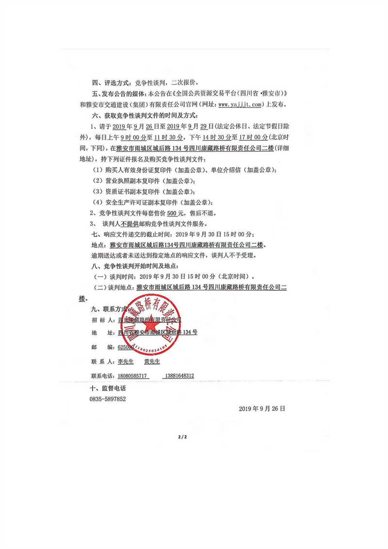 四川康藏路桥有限责任公司国道351线硗碛至夹金山段路面改造工程波形护栏采购竞争性谈判公告