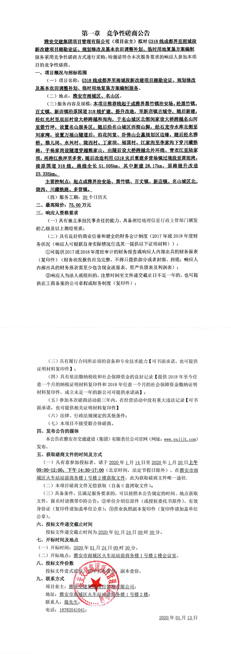 大红鹰dhy(中国)集团项目管理有限公司G318线成都界至雨城段新改建项目踏勘论证、规划修改及基本农田调整补划、临地用地复垦方案编制服务竞争性磋商公告