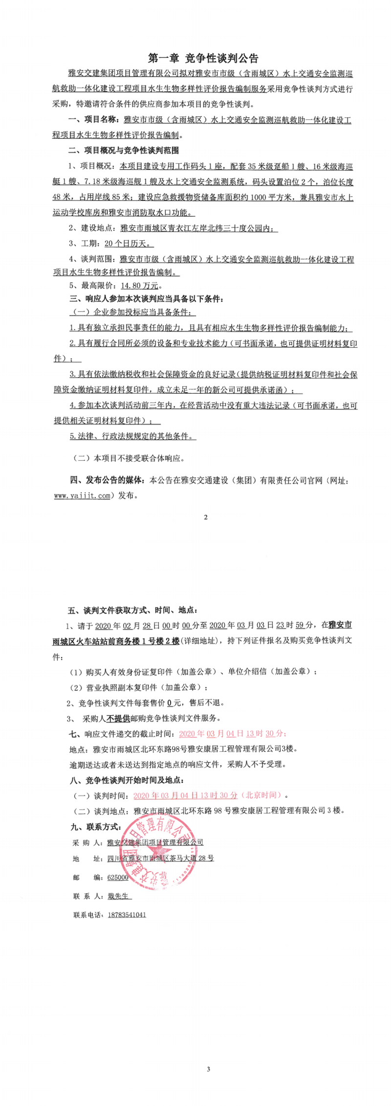 大红鹰dhy(中国)集团项目管理有限公司雅安市市级(含雨城区)水上交通安全监测巡航救助一体化建设工程项目水生生物多样性评价报告编制竞争性谈判公告