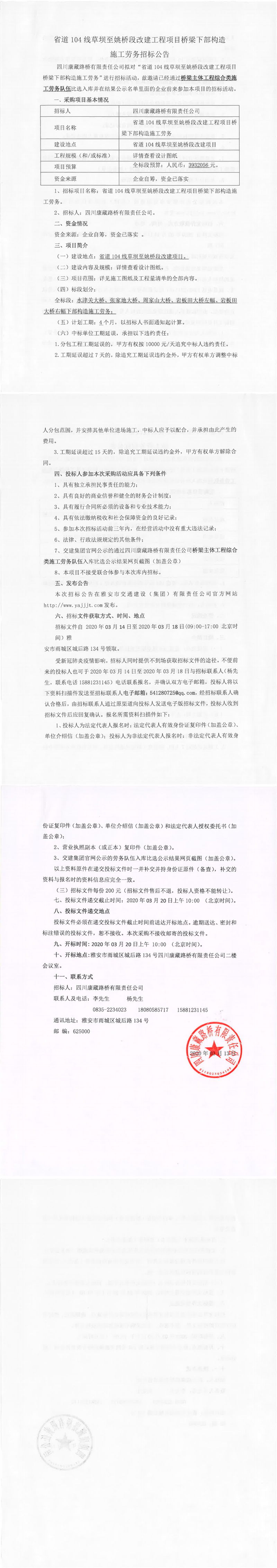 四川康藏路桥有限责任公司省道104线草坝至姚桥段改建工程项目桥梁下部构造施工劳务招标公告