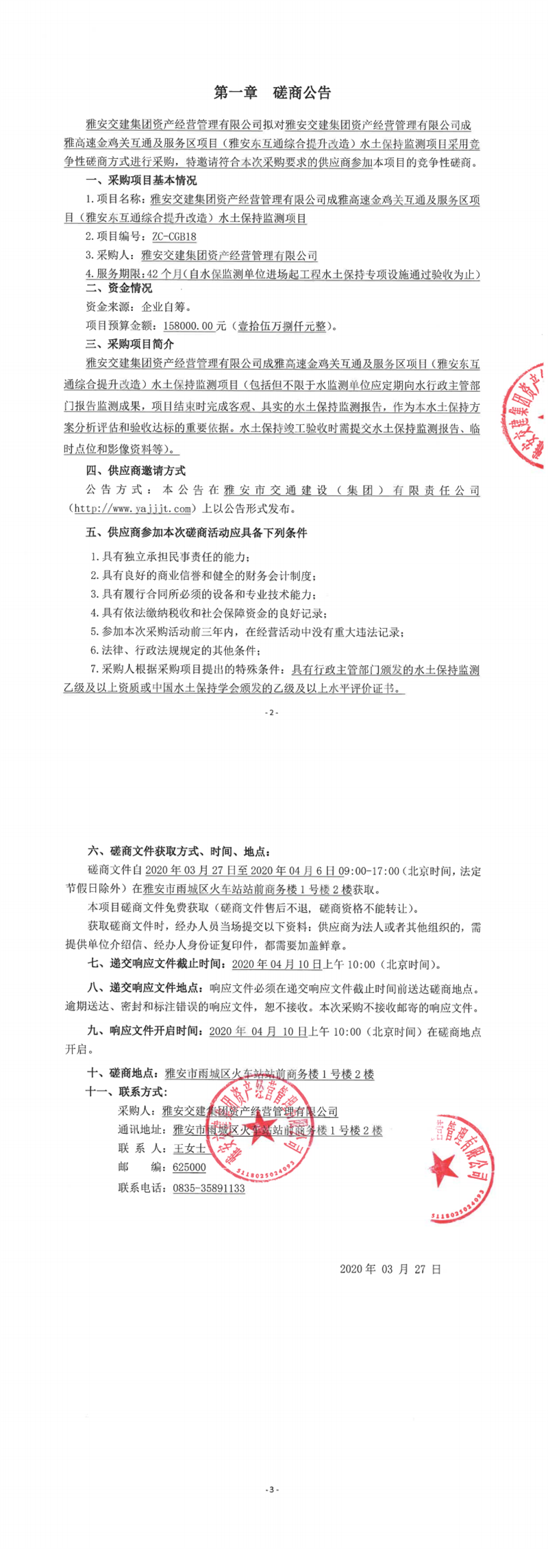 大红鹰dhy(中国)集团资产经营管理有限公司成雅高速金鸡关互通及服务区项目(雅安东互通综合提升改造)水土保持监测项目竞争性磋商公告