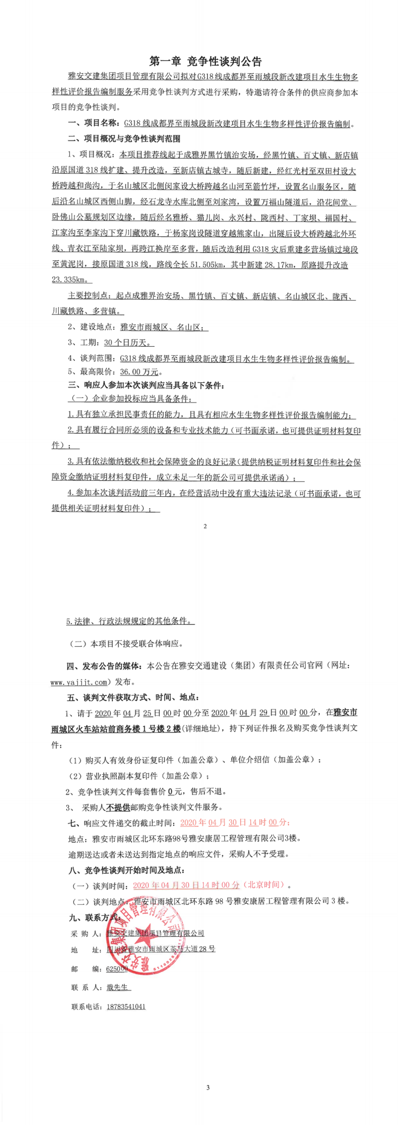 大红鹰dhy(中国)集团项目管理有限公司G318线成都界至雨城段新改建项目水生生物多样性影响评价编制竞争性谈判公告