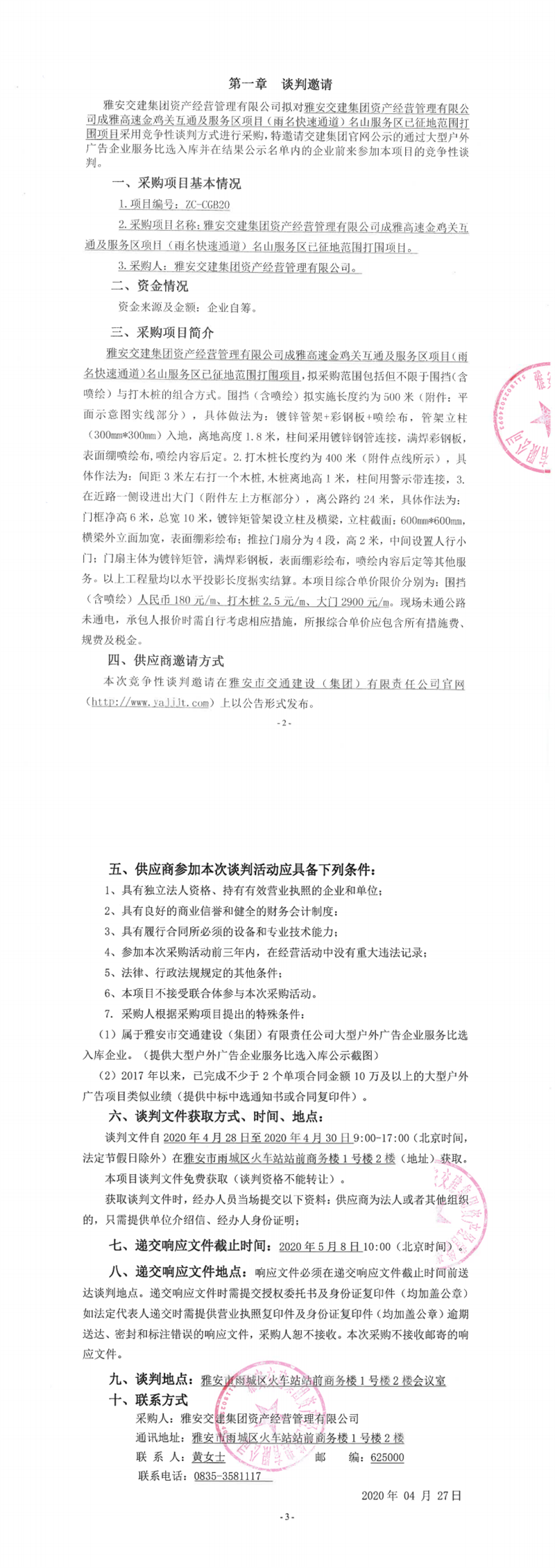大红鹰dhy(中国)集团资产经营管理有限公司成雅高速金鸡关互通及服务区项目(雨名快速通道)名山服务区已征地范围打围项目竞争性谈判公告