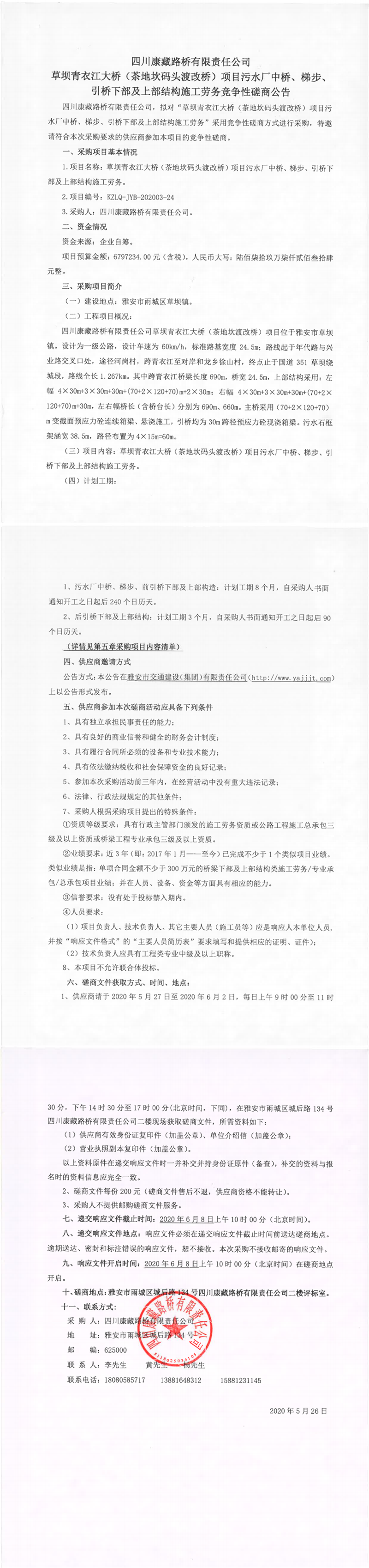 四川康藏路桥有限责任公司草坝青衣江大桥(茶地坎码头渡改桥)项目污水厂中桥、梯步、引桥下部及上部结构施工劳务竞争性磋商公告