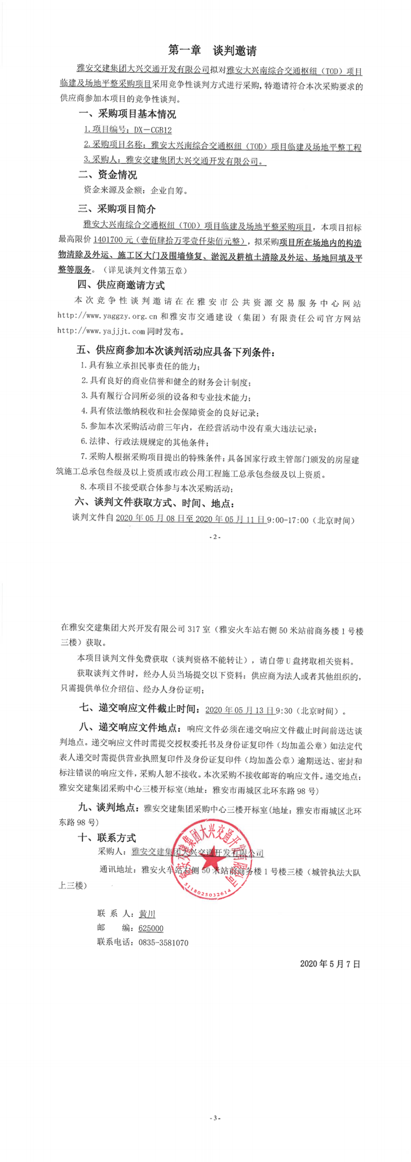 大红鹰dhy(中国)集团大兴交通开发有限公司雅安大兴南综合交通枢纽(TOD)项目临建及场地平整工程竞争性谈判公告