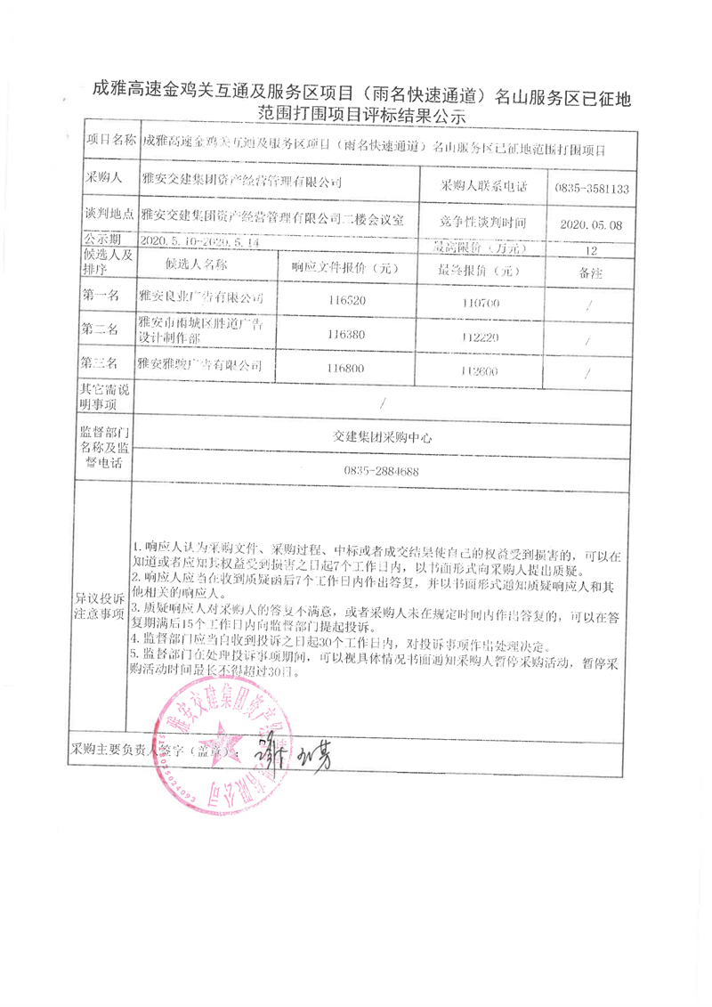 大红鹰dhy(中国)集团资产经营管理有限公司成雅高速金鸡关互通及服务区项目(雨名快速通道)名山服务区已征地范围打围项目评标结果公示