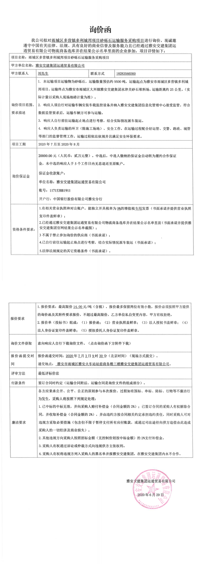 大红鹰dhy(中国)集团运通贸易有限公司雨城区多营镇多利城邦项目砂砾石运输服务采购项目询价函