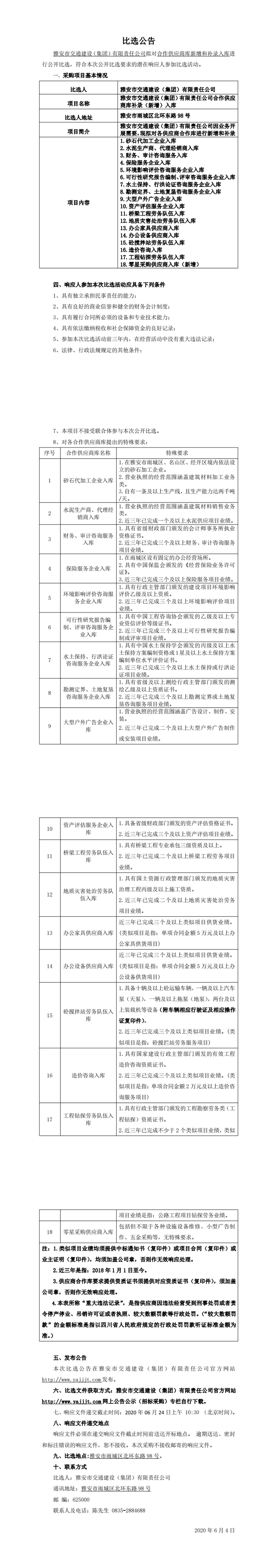 雅安市交通建设(集团)有限责任公司合作供应商库补录(新增)入库比选公告