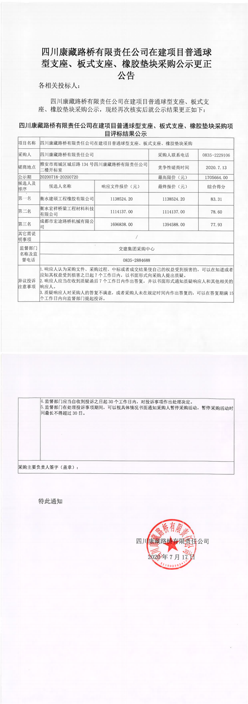 四川康藏路桥有限责任公司在建项目普通球型支座、板式支座、橡胶垫块采购公示更正公告