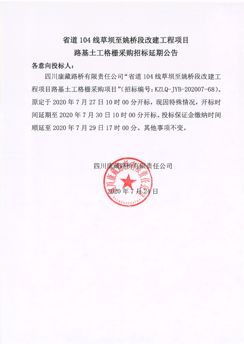 四川康藏路桥有限责任公司省道104线草坝至姚桥段改建工程项目路基土工格栅采购招标延期公告