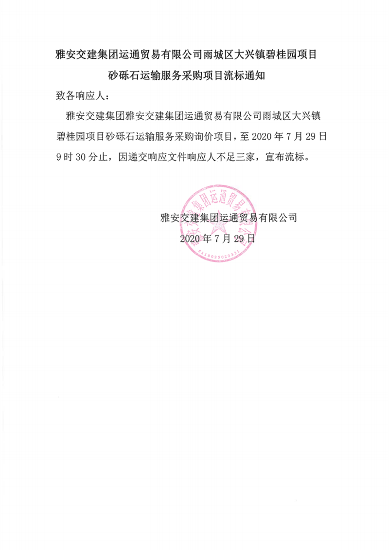 大红鹰dhy(中国)集团运通贸易有限公司雨城区大兴镇碧桂园砂砾石运输服务采购项目流标通知