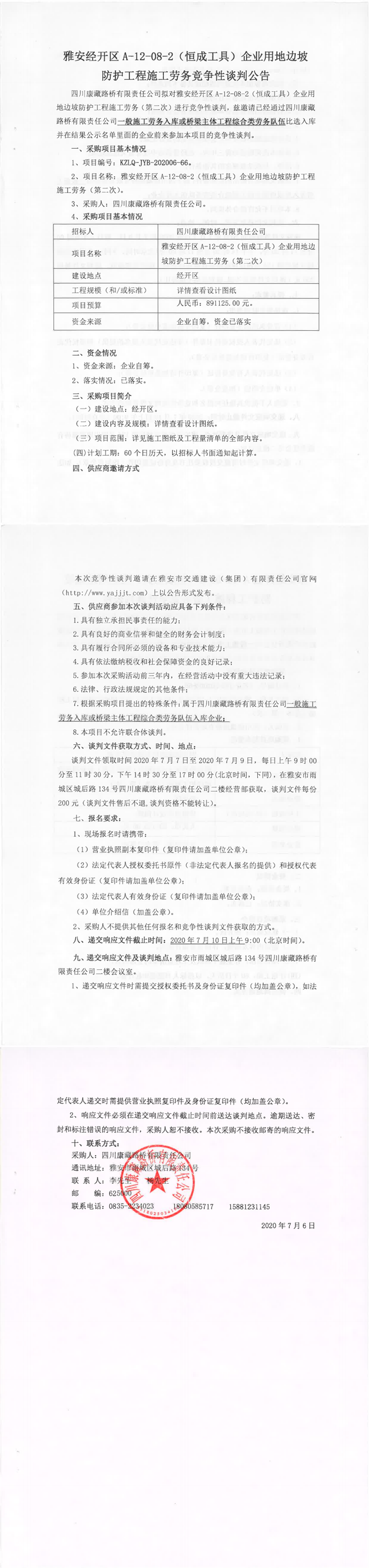 四川康藏路桥有限责任公司雅安经开区A-12-08-2(恒成工具)企业用地边坡防护工程施工劳务(第二次)竞争性谈判公告