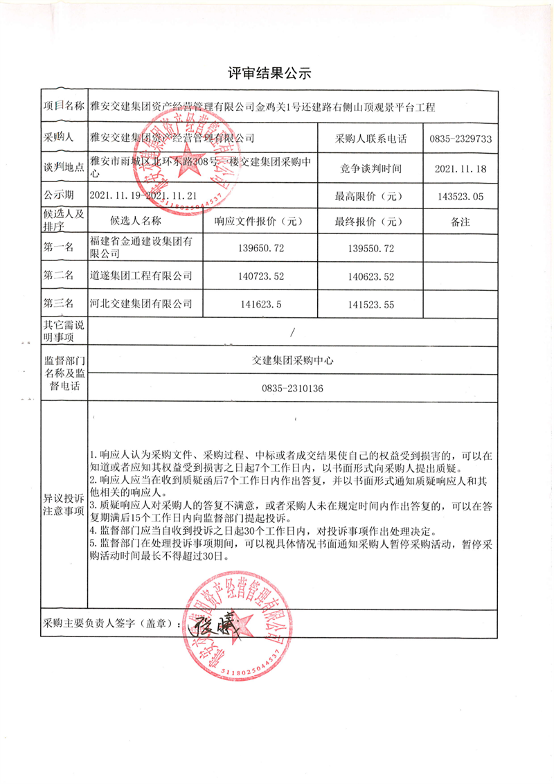 大红鹰dhy(中国)集团资产经营管理有限公司金鸡关1号还建路右侧山顶观景平台工程评审结果公示