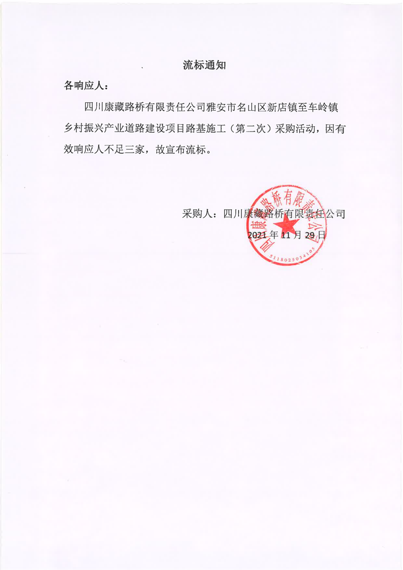 四川康藏路桥有限责任公司雅安市名山区新店镇至车岭镇乡村振兴产业道路建设项目路基施工(第二次)流标通知