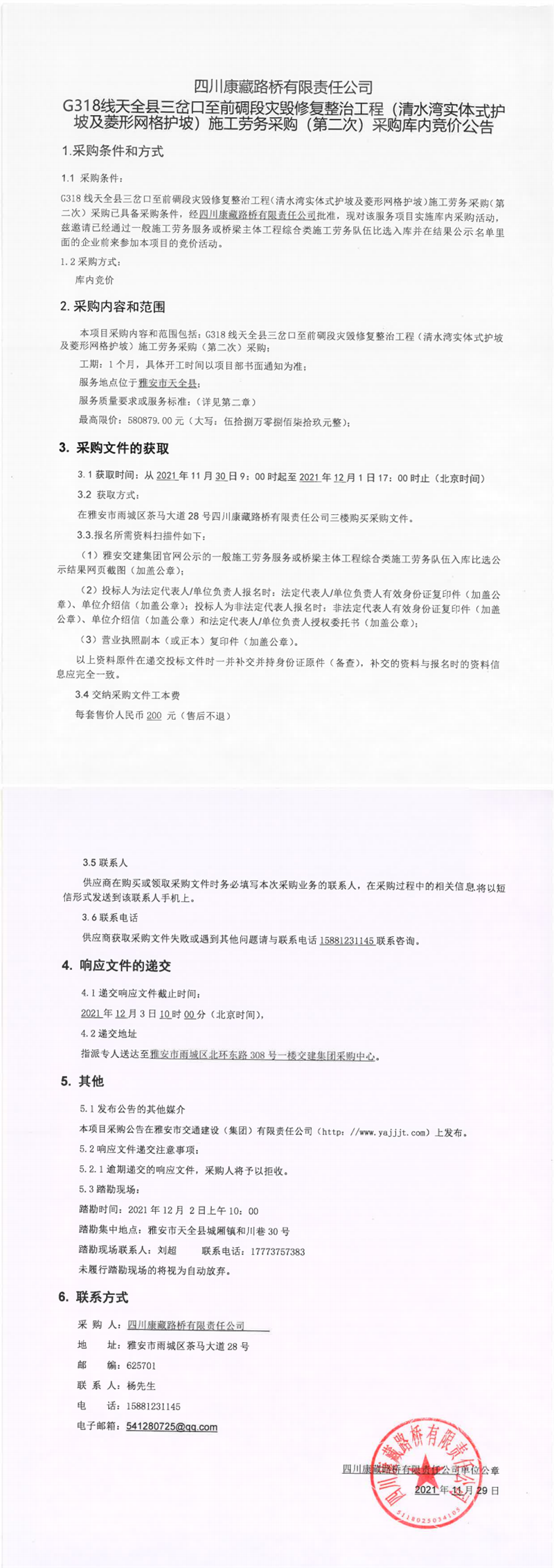 四川康藏路桥有限责任公司G318线天全县三岔口至前碉段灾毁修复整治工程(清水湾实体式护坡及菱形网护坡)施工劳务采购(第二次)采购库内竞价公告