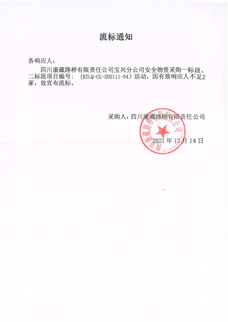 四川康藏路桥有限责任公司宝兴分公司安全物资采购一标段、二标段项目流标通知