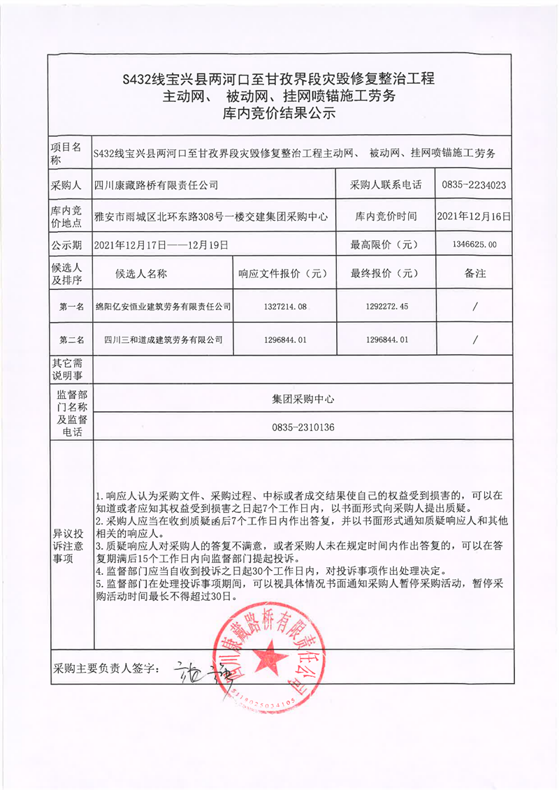 四川康藏路桥有限责任公司S432线宝兴县两河口至甘孜界段灾毁修复整治工程主动网、补动网、挂网喷锚施工劳务库内竞价结果公示
