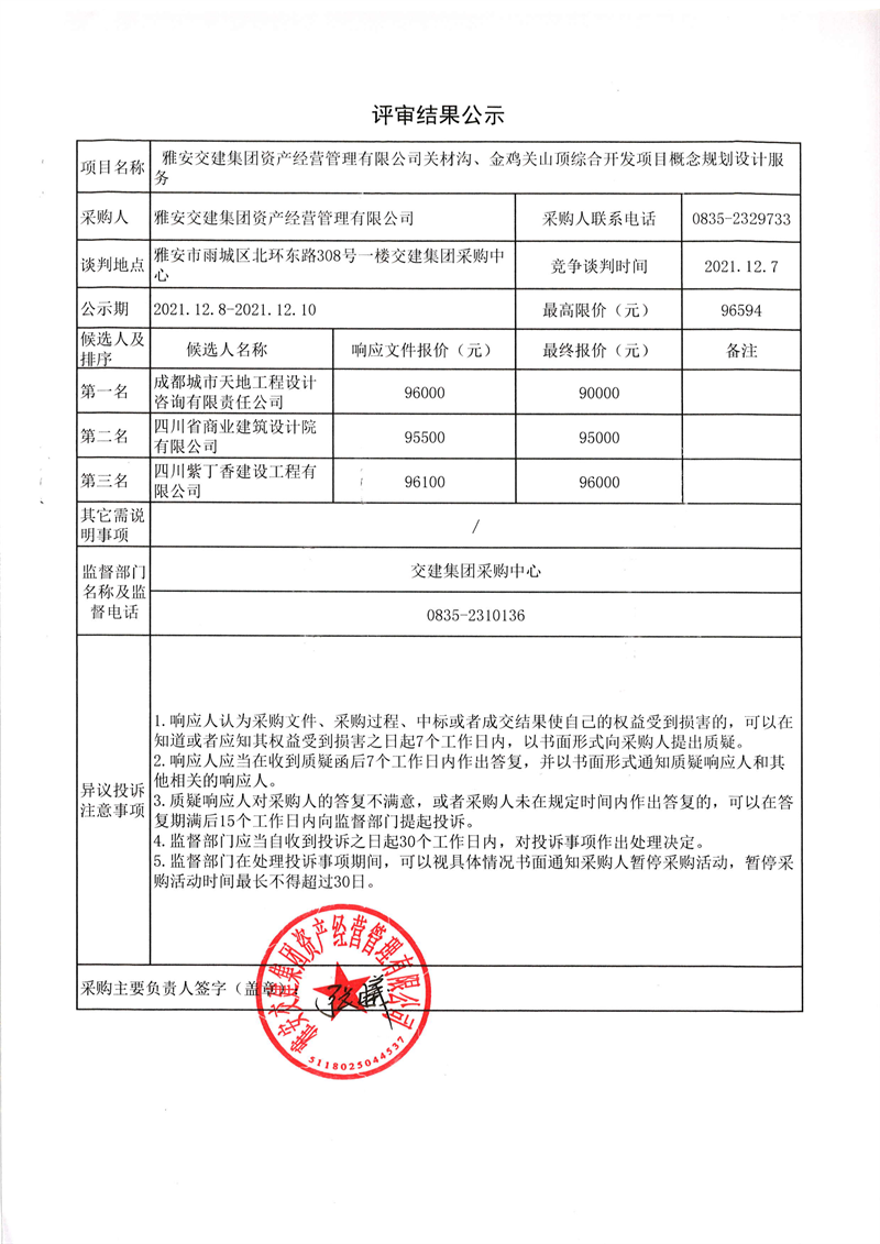 大红鹰dhy(中国)集团资产经营管理有限公司关材沟、金鸡关山顶综合开发项目概念规划设计服务评审结果公示