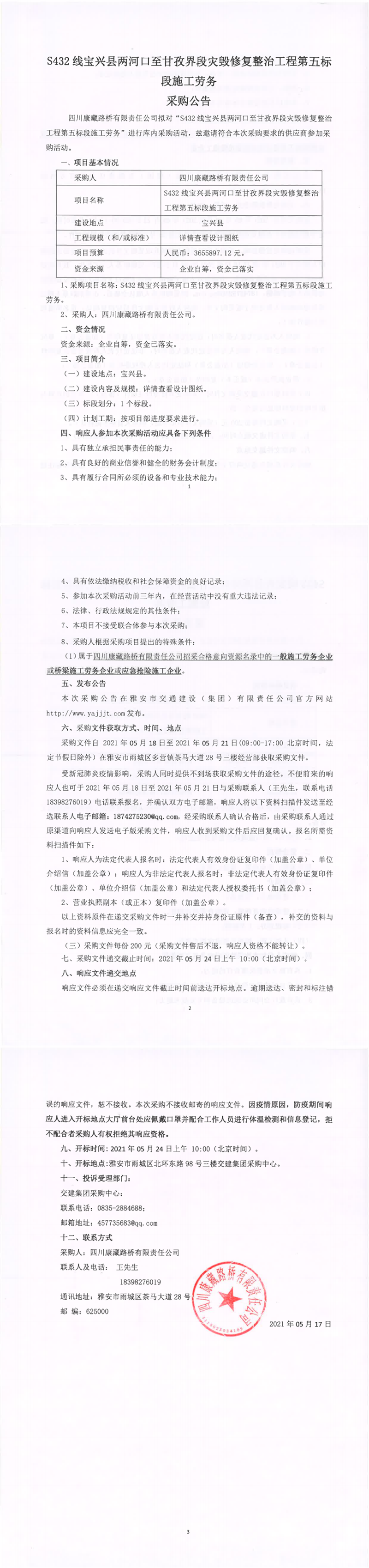 四川康藏路桥有限责任公司S432线宝兴县两河口至甘孜界段灾毁修复整治工程第五标段施工劳务采购公告