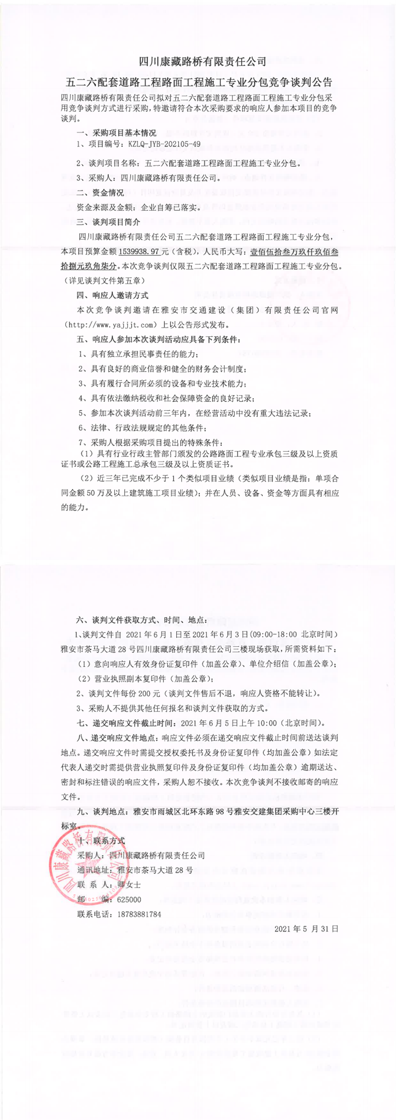 四川康藏路桥有限责任公司五二六配套道路工程路面工程施工专业分包竞争谈判公告