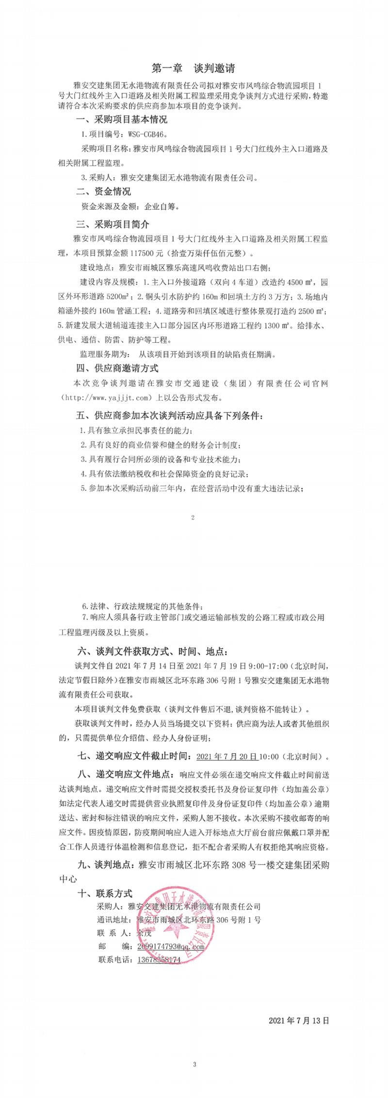 大红鹰dhy(中国)集团无水港物流有限责任公司雅安市凤鸣综合物流园项目1号大门红线外主入口道路及相关附属工程监理竞争谈判公告