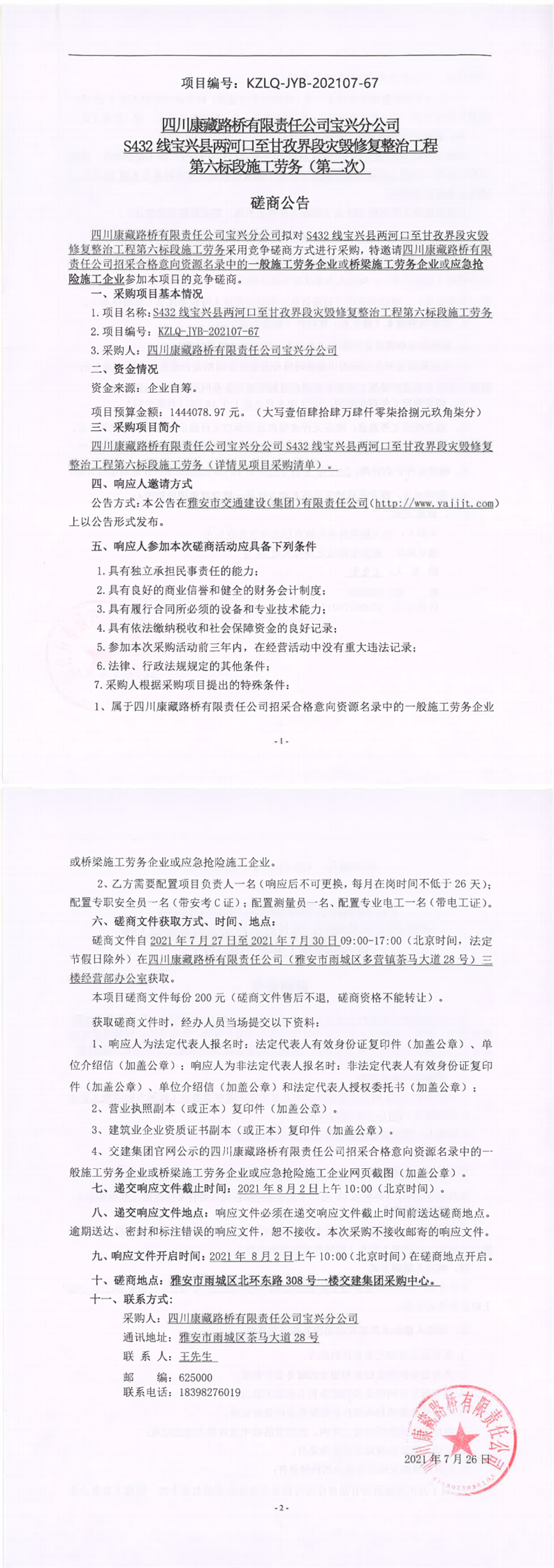 四川康藏路桥有限责任公司S432线宝兴县两河口至甘孜界段灾毁修复整治工程第六标段施工劳务(第二次)竞争磋商公告