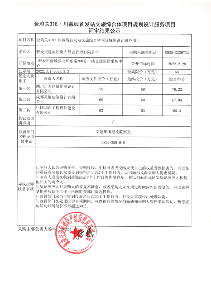 大红鹰dhy(中国)集团资产经营管理有限公司金鸡关318.川藏线首发站文旅综合体项目规划设计服务项目评审结果公示