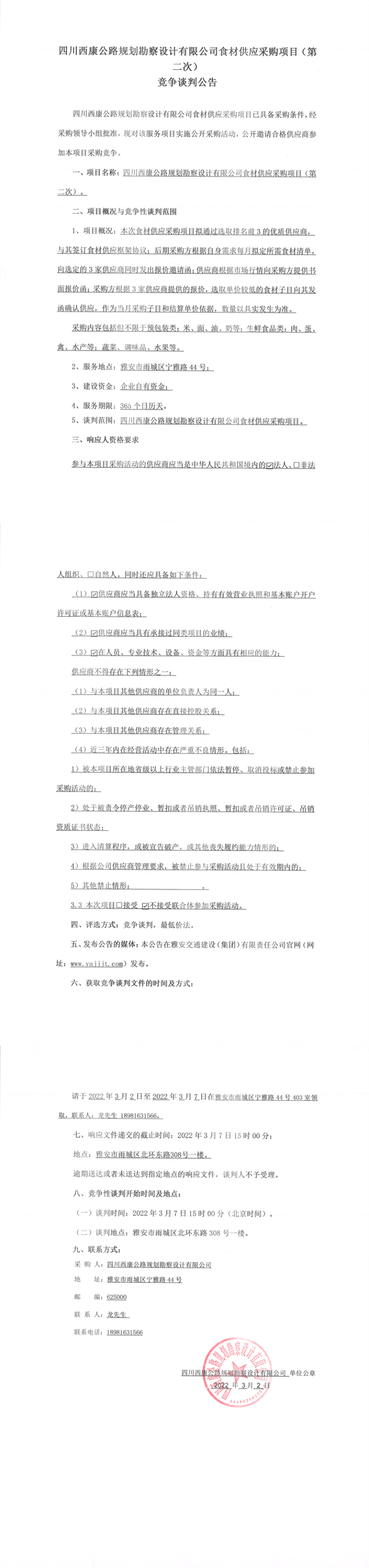 四川西康公路规划勘察设计有限公司食材供应采购项目(第二次)竞争谈判公告
