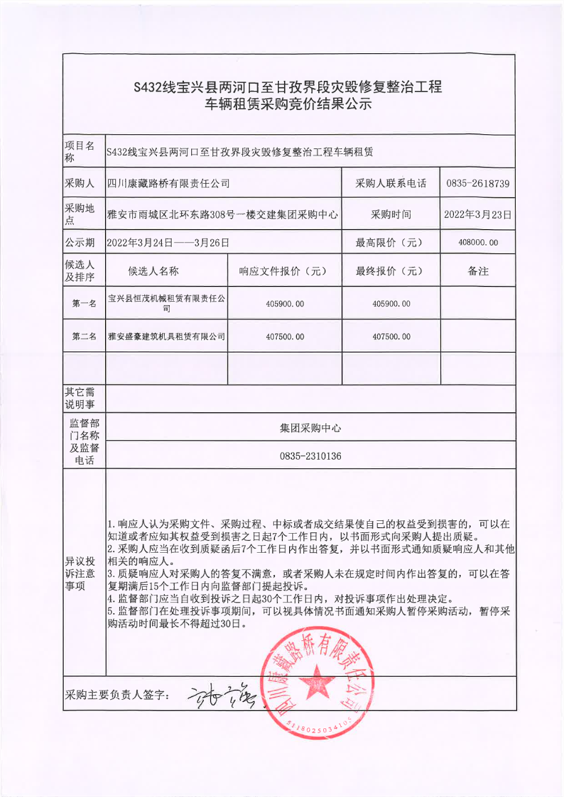 四川康藏路桥有限责任公司S432线宝兴县两河口至甘孜界段灾毁修复整治工程车辆租赁采购竞价结果公示