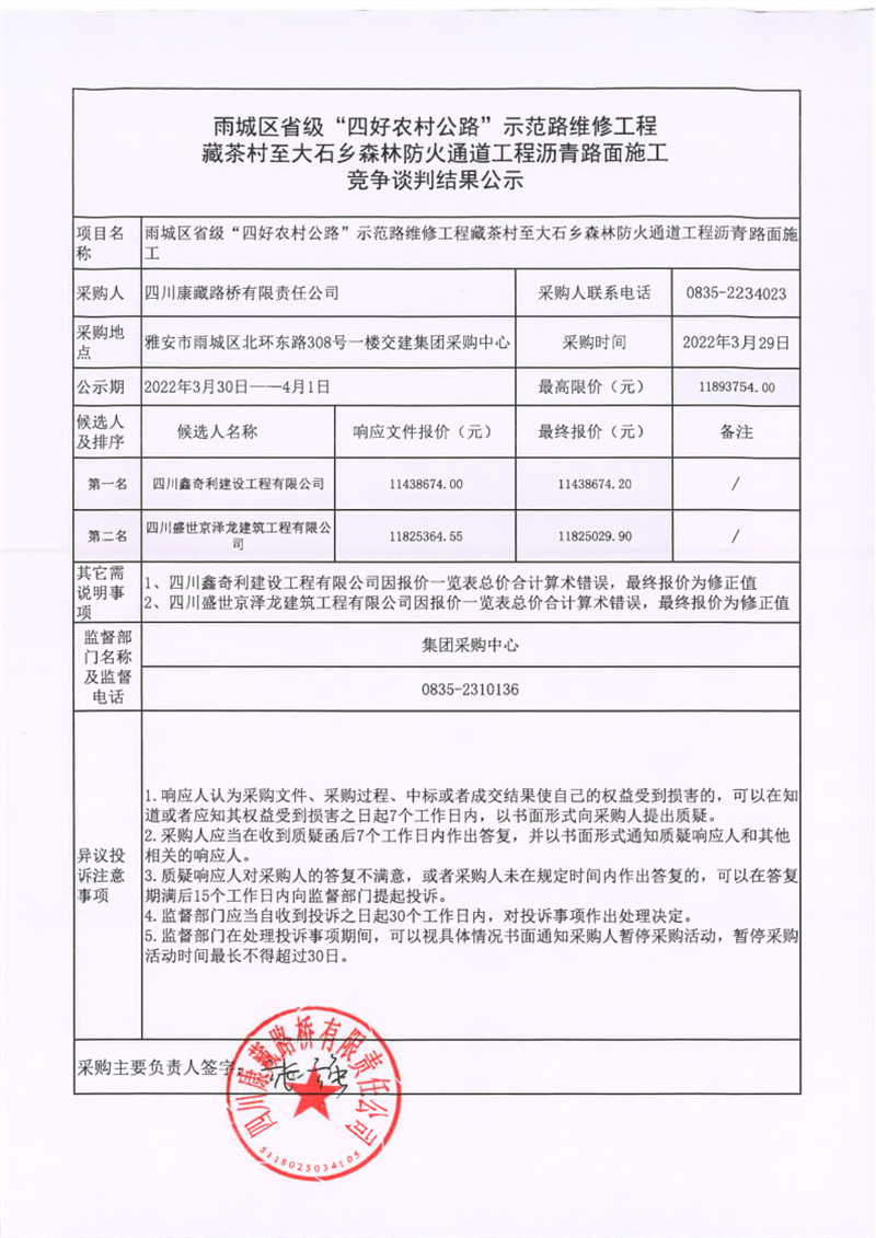 四川康藏路桥有限责任公司雨城区省级“四好农村公路”示范路维修工程藏茶村至大石乡森林防火通道工程沥青路面施工竞争谈判结果公示
