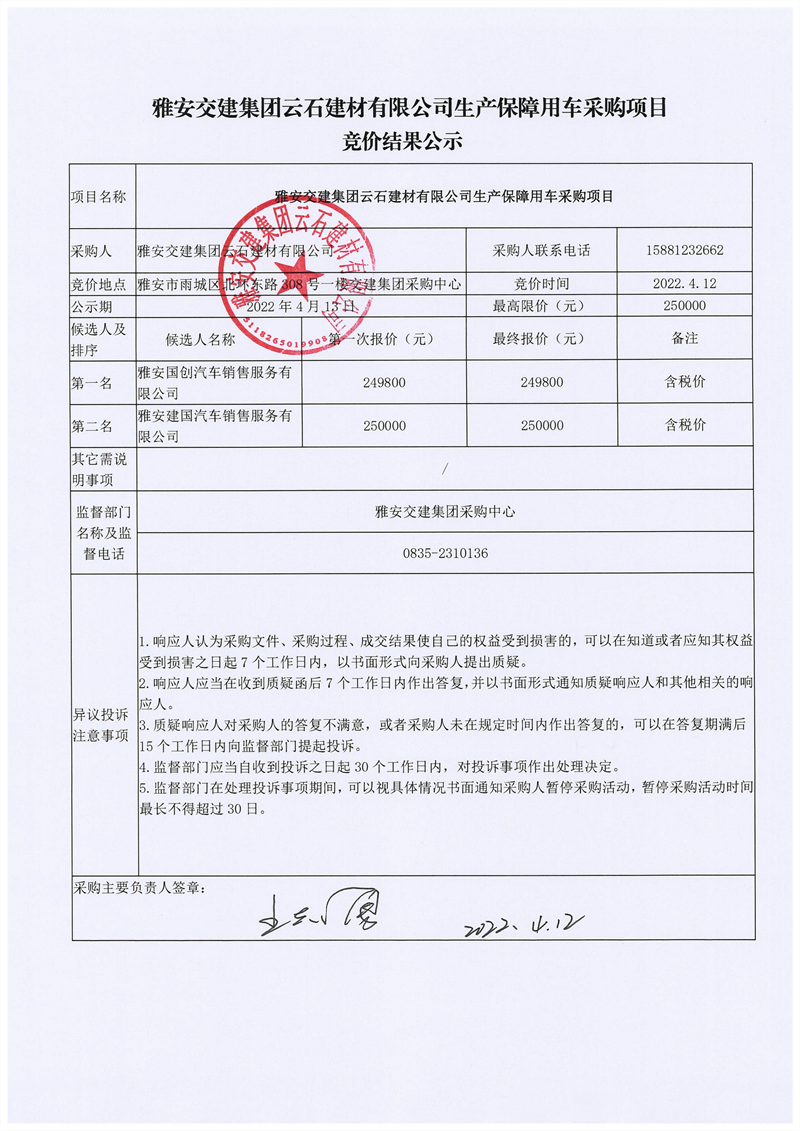大红鹰dhy(中国)集团云石建材有限公司生产保障用车采购项目竞价结果公示