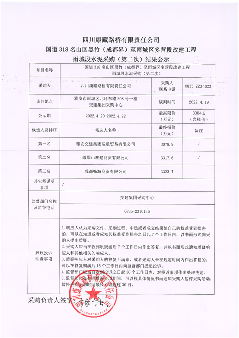 四川康藏路桥有限责任公司国道318名山区黑竹(成都界)至雨城区多营段改建工程雨城段水泥采购(第二次)结果公示
