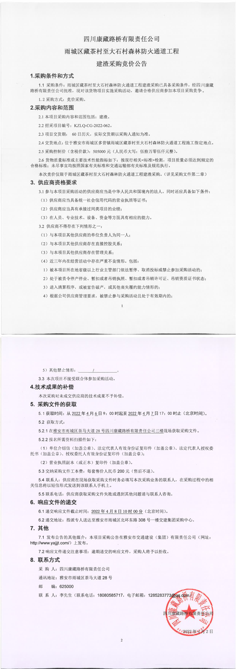 四川康藏路桥有限责任公司雨城区藏茶村至大石村森林防火通道工程建渣采购竞价公告