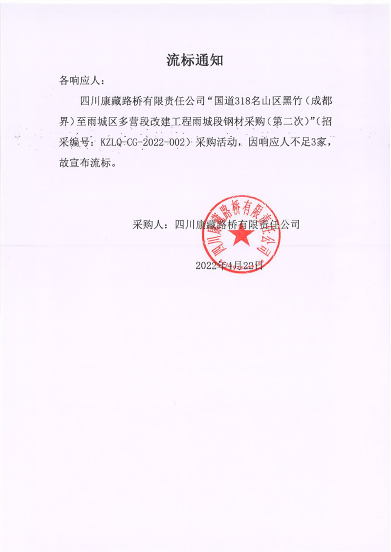 四川康藏路桥有限责任公司国道318名山区黑竹(成都界)至雨城区多营段改建工程雨城段钢材采购(第二次)流标通知