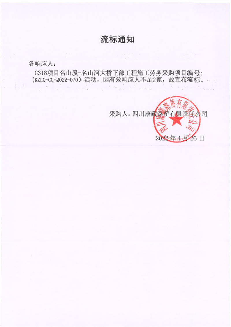 四川康藏路桥有限责任公司G318项目名山段-名山河大桥下部工程施工劳务采购项目流标通知