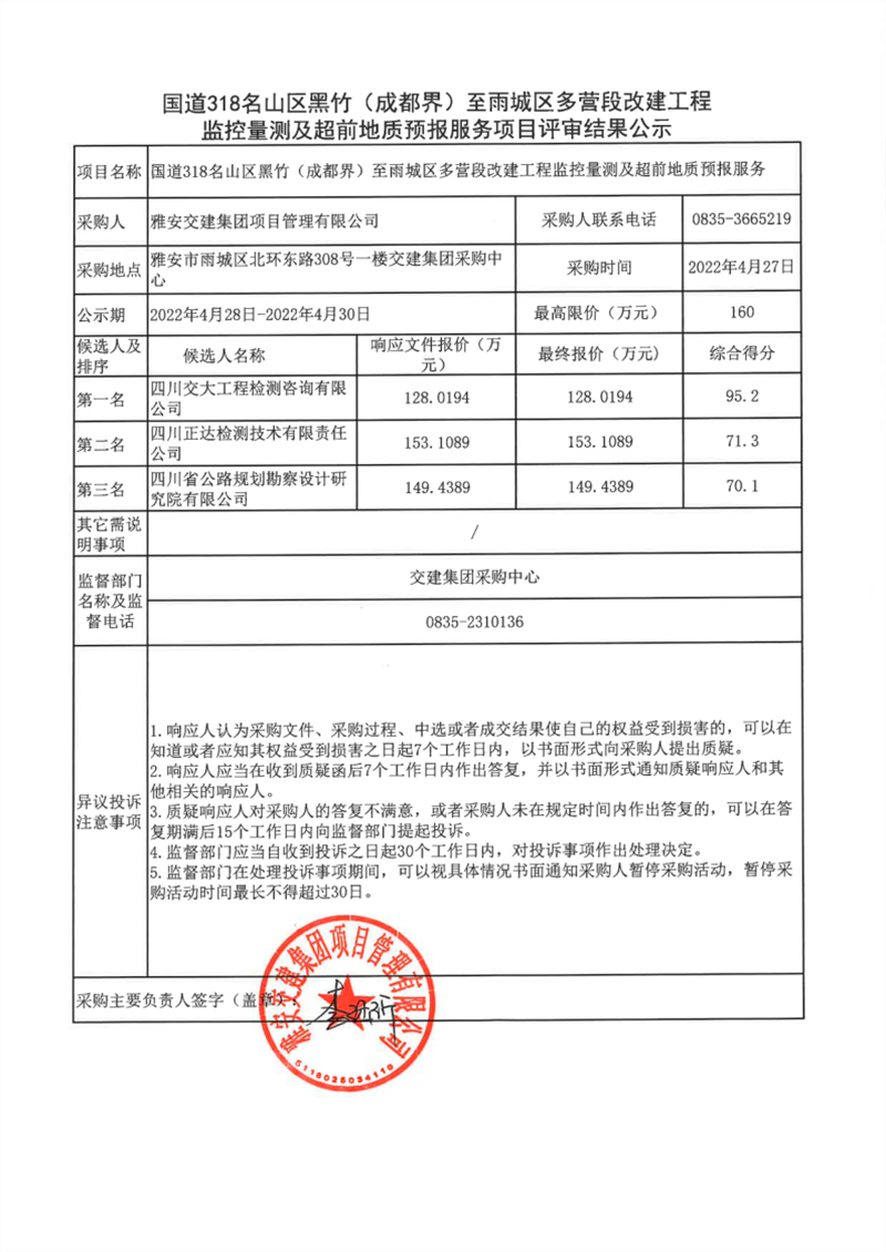 大红鹰dhy(中国)集团项目管理有限公司国道318名山区黑竹(成都界)至雨城区多营段改建工程监控量测及超前地质预报服务项目评审结果公示