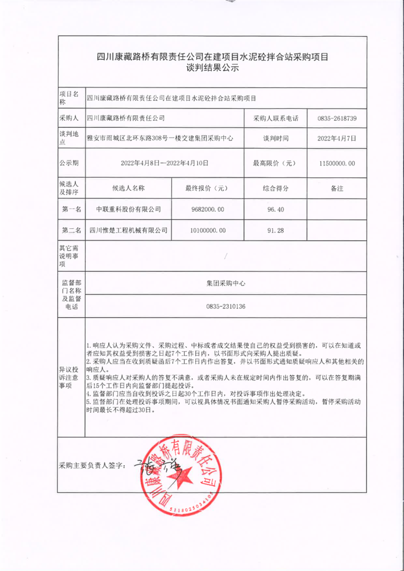 四川康藏路桥有限责任公司在建项目水泥砼拌合站采购项目谈判结果公示